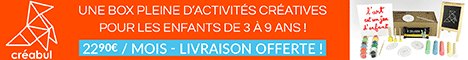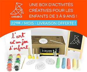 C’est une Box Créative Créabul qui contient au moins 5 activités pour les 3 ans et plus. Ça marche sous forme d’abonnement ou en achetant la box à l’unité. Cela fait aussi un cadeau original, dans ce cas là on conseillerait carrément la Box Découverte avec un contenu XL !