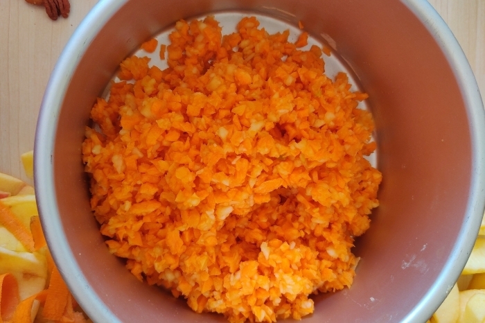 - On râpe toutes les carottes et une pommes (au thermomix c’est vitesse 5 pendant 1 minute max).