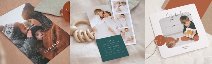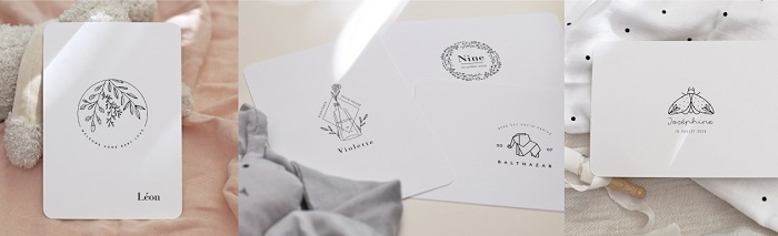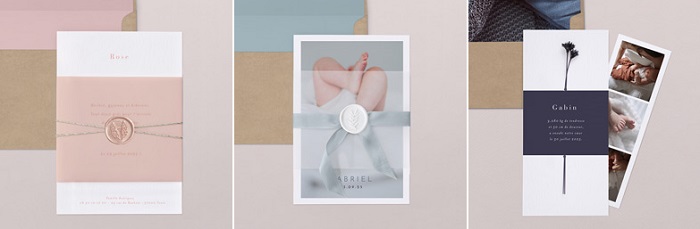 Les collections créatives sont vraiment «leur marque de fabrique», le dessin et le façonnage sont inédit. On retrouve ainsi différents styles : minimalistes ou « arty », sobres ou colorés. Des petits accessoires bien placés sortent de l’ordinaire : des fleurs séchées, des nœuds ou écussons. L’ensemble change par rapport à ce qu’on peut voir habituellement en matière de faire-part naissance. Nous aimons les formes de découpe, l’impression dorée, les variétés de formats et les enveloppes coordonnées.