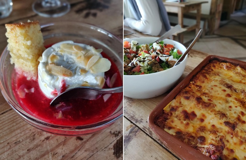 Ce n’est pas parce qu’on est loin de tout que le repas proposé est frugal, au contraire ! Tout le monde aide à dresser les tables et l’on mange sur de grandes tablées à 19 heures précises ! Au menu ce soir le chef a proposé : soupe de carottes au gingembre, salade mixte et lasagnes, fromages de la région, faisselle et coulis de framboise maison sans oublier un petit financier. Vous l’aurez compris tout est issus de produits locaux. Tout est maison y compris le pain pétri et cuit sur place et en plus tout est excellent ! Il parait que le fondant au chocolat et la tarte à la myrtille méritent également le déplacement !