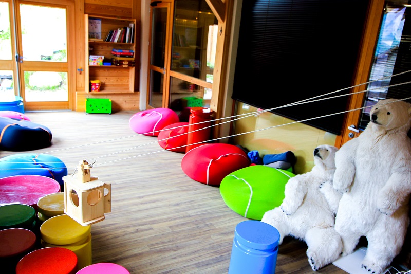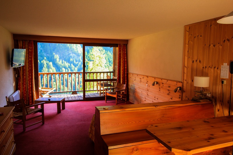 En plein centre, une bâtisse ancienne en pierre bordée de Mélèzes, avec une jolie terrasse et des balcons donnant sur la barre de montagne en face. Une salle de jeu avec babyfoot, une de billard, une autre de ping pong, à l’extérieur un trampoline et une balançoire. Les Chalets du Villard, le paradis des famille ? Si je vous dit qu’en plus les chambres sont de vrais studios avec quatre couchages et un coin cuisine, que le repas est agréable et petit déjeuner frais et varié …