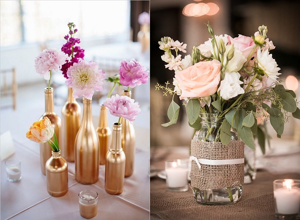 Utiliser une jolie nappe blanche et y ajouter au centre de table de la toile de jute, une planche de joli bois pas trop épaisse ou des plaques d’ardoise.- Il ne faut pas hésiter à penser à la récup ! L’on peut personnaliser de jolies boites de conserve couleurs métal, des napperons blancs, des vases que l’on repeint en blanc, doré ou argenté mat. Détourner certains objets rend la décoration particulièrement originale. Il est possible d’utiliser des lanternes ou des bocaux en verre pour les remplir de fleurs.