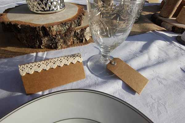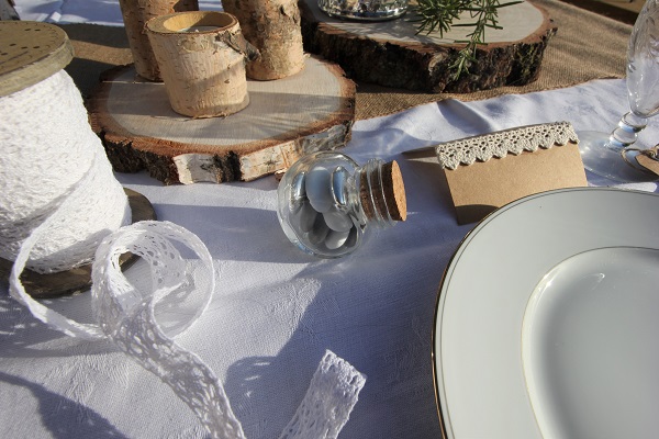 Utiliser une jolie nappe blanche et y ajouter au centre de table de la toile de jute, une planche de joli bois pas trop épaisse ou des plaques d’ardoise.