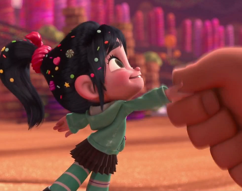 - Vanellope Van Schweetz quant à elle, évolue dans un jeu de course , fabriqué uniquement de sucreries. Son gros défaut : être une erreur de programme, ce qui lui vaut d’être interdite de course et rejetée de tous…