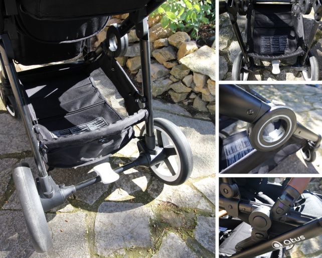 Les finitions ont été très bien travaillées et conçues : le guidon avec imitation cuir est aussi joli que pratique puisque réglable en plusieurs hauteurs. Le panier est pratique et les canopy extensives (relativement bien couvrants), les hamacs inclinables en 3 positions jusqu’à la position couchée (mais pas totalement allongés pour être homologués nouveau-né), les reposes pieds sont ajustables et sur les deux sièges, chaque siège dispose d’une barre de maintient.