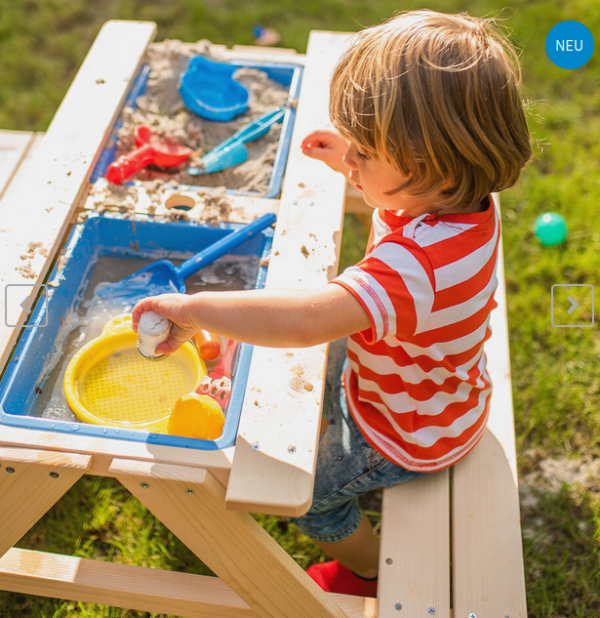Nous ne pouvons que vous conseiller l’ensemble Pinolino Nicki équipé de deux bacs et d’un plan de travail amovible et juste en dessous on peut ranger les moules, sots et pelles.On le trouve à 84 euros chez notre part chez notre partenaire Univers Poussette.