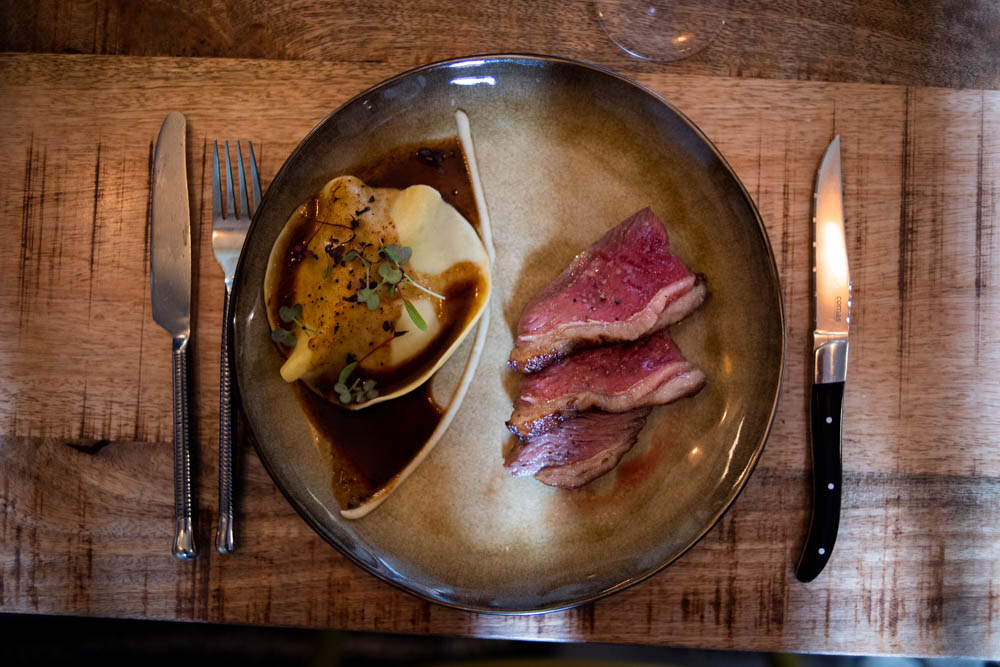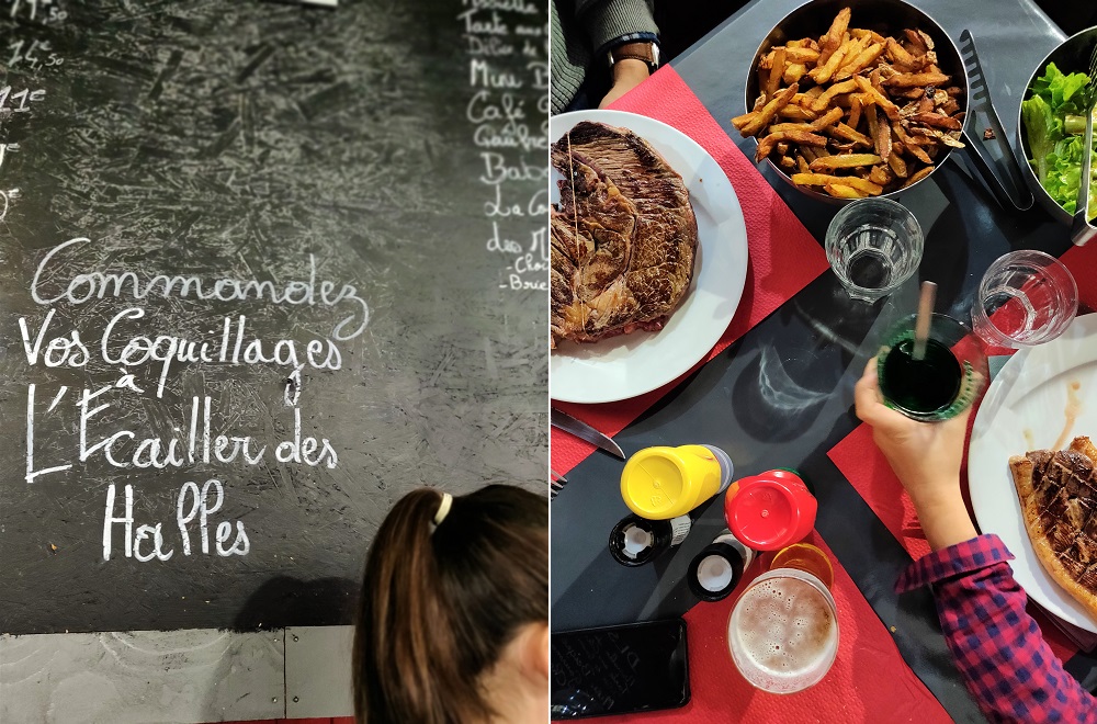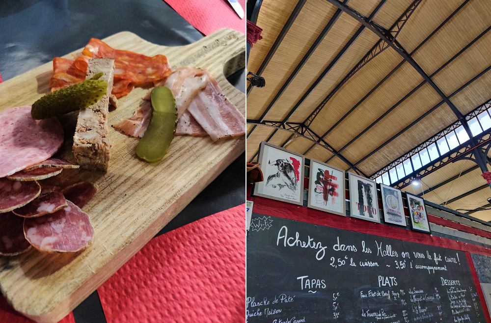 Dans un style différent, il faut aussi rendre visite à Sébastien implanté au Halles. Ce bâtiment de la fin du 19eme abrite un grand marché couvert classé monument historique. C’est l’endroit où l’on vient discuter, tester et goûter. Tous les matins de l’année, jusqu’à treize heures çà bouillonne de vie dans les allées. Et l’on peut choisir une viande directement à la carte ou la commander dans une des étales, le chef la faisant cuire pour nous. Accompagnée d’une salade et de frites fraiches on la déguste sur des tables hautes ou basses.