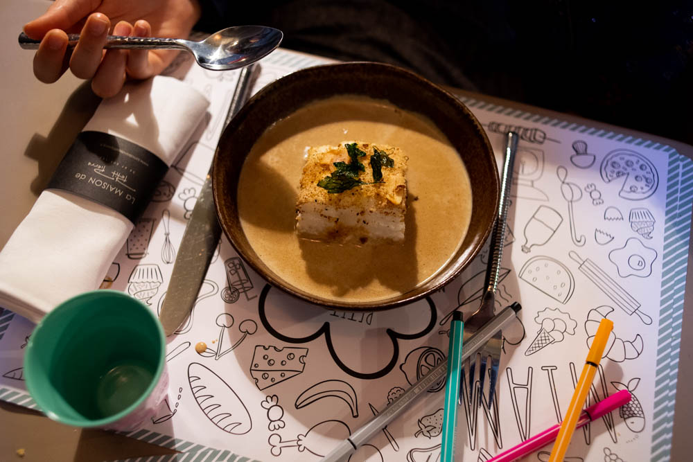 Et s’il ne peut que satisfaire le palais des parents à des tarifs parfaitement cohérent il n’oublie pas les enfants. Ils profitent de set de tables à colorier, d’une jolie vaisselle et de plats adaptés rien que pour eux qui suscitent leur curiosité mais aussi leur adhésion.