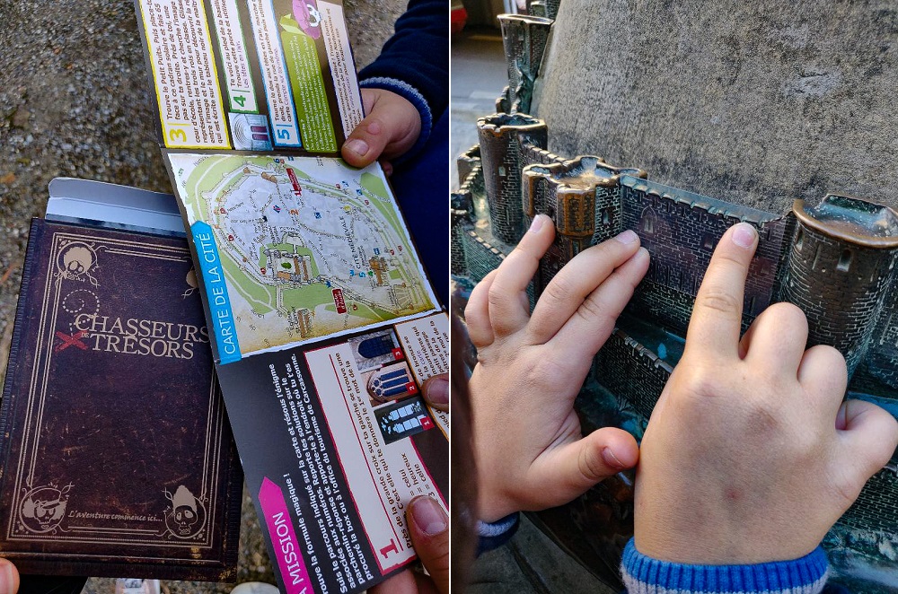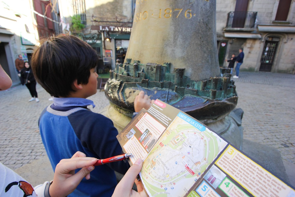 Il est possible d’acheter à l’Office du Tourisme une petite boite « chasseurs de trésors » qui servira de support à une véritable chasse aux trésors moyennant 13€. On dispose ainsi d’une carte, d’un miroir, de fiches énigmes, d’un stylo pas si banal que cela, d’une réglette transparente et d’une carte postale. Les aventuriers prennent un grand plaisir à arpenter les ruelles, lever les yeux sur les gargouilles, traquer les détails architecturaux sur les maisons, les tours et les puits. Un jeu qui permet aux petits mais aussi aux parents de mieux découvrir l’intérieur de la cité.