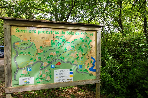La seule difficulté est d’arriver à trouver le panneau de départ des randonnées (entre les villages de Chassagnes et des Borels, le point de rdv GPS le plus simple est le restaurant de l’Olivier de Païolive). Pour le reste c’est ombragé, le niveau est facile. Vous pourrez choisir parmi trois itinéraires de couleurs (balade entre min et 1h30).