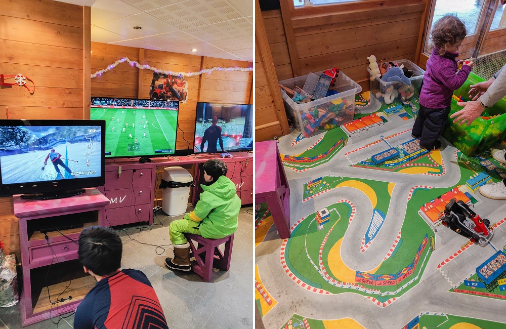 Au niveau de l’entrée un bel espace d’accueil attend petits et grands avec des jeux pour les bébés, des jeux vidéos en libre service (très pratique au moment du chek-in), un joli feu de cheminée, goûter et boissons à disposition la journée. On peut y emprunter des jeux de société en tout genre (en très bon état, complets et l’offre est variée) mais aussi un sèche cheveux ou un magazine.