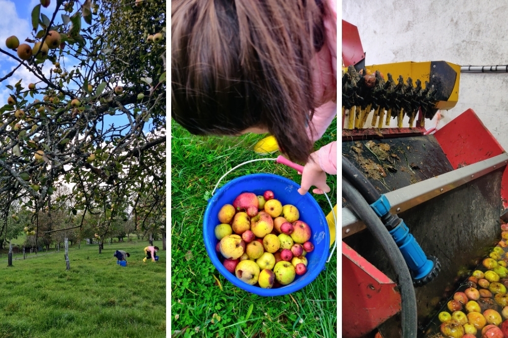 Dans cette exploitation en agriculture biologique on laisse les pommes tomber et on les ramasse au sol lorsqu’elles sont bien mures et pleines de sucre. Les petits ont pu observer dans le cadre des évènements La Ferme en Folie comment on trie les pommes, comment fonctionne le pressoir, la cuverie et la mise en bouteille. Mais le meilleur moment reste la dégustation !