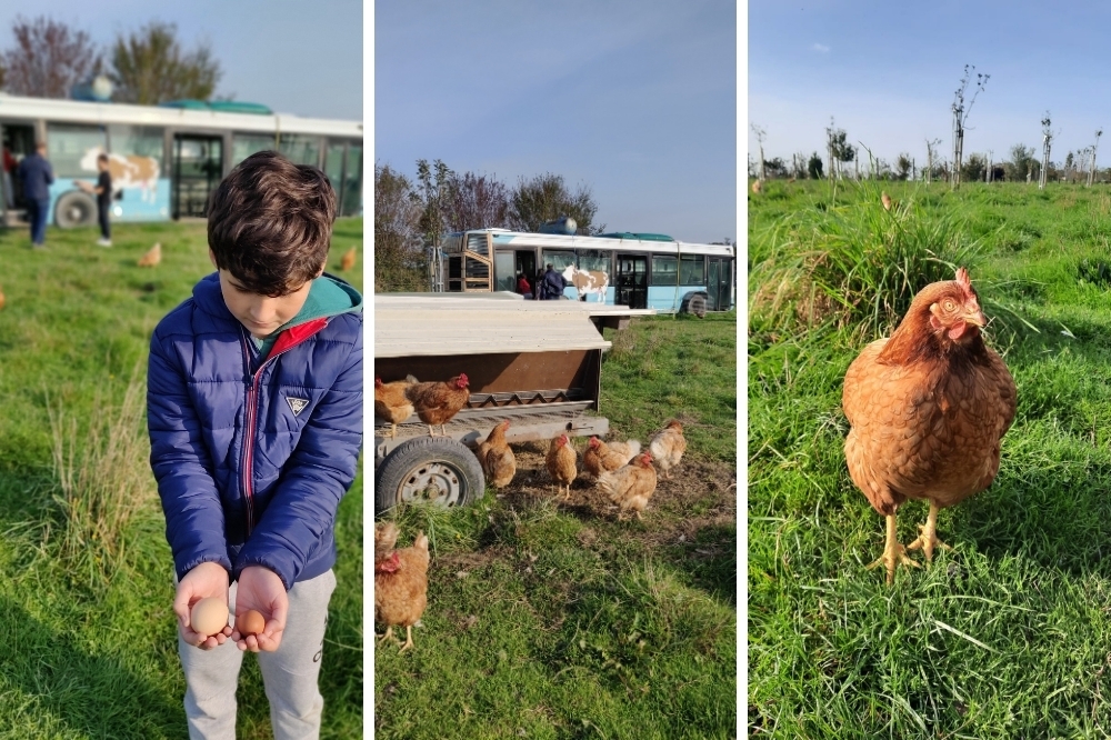 Quel bonheur pour les petits de ramasser des pommes de toute sorte, taille et couleur ! Quel plaisir de découvrir les petits veau et le rôle crucial qu’ils jouent dans l’exploitation ! Ils retournent la terre juste comme il faut et la fertilise en semant leur bouse entre les arbres fruitiers.