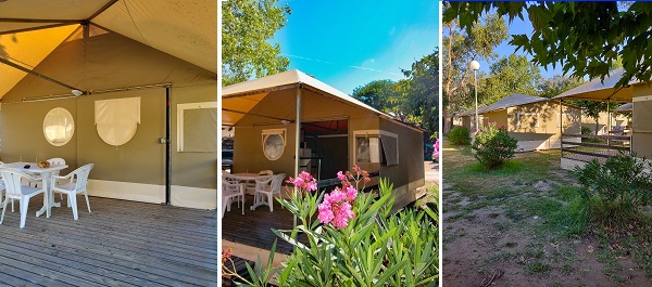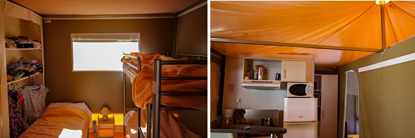 Les lodges en toile sont aménagés pour 4 ou 5 personnes : équipés de deux chambres, d’un réfrigérateur-congélateur, d’un coin cuisine avec tout le matériel nécessaire, des plaques, un micro-ondes et cafetière. La literie est simple, ferme mais assez basique, la terrasse en bois ombragée est très agréable. Une vraie vie de camping mais avec des lits, des rangements, une salle de bain et des toilettes !