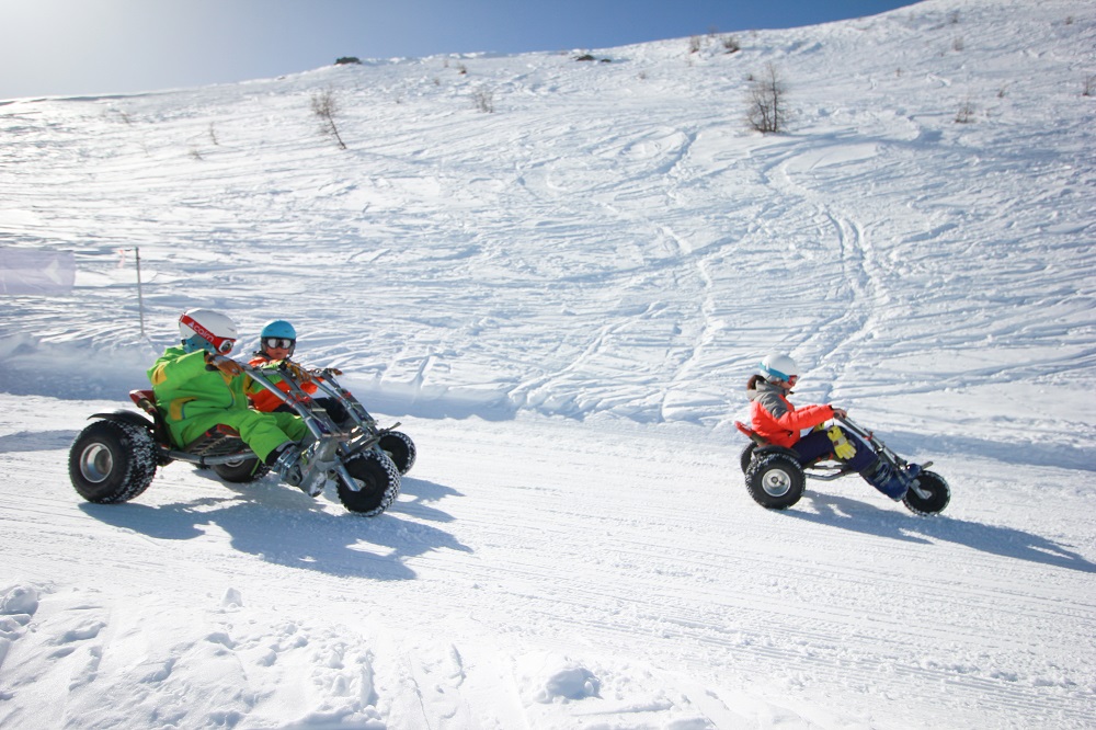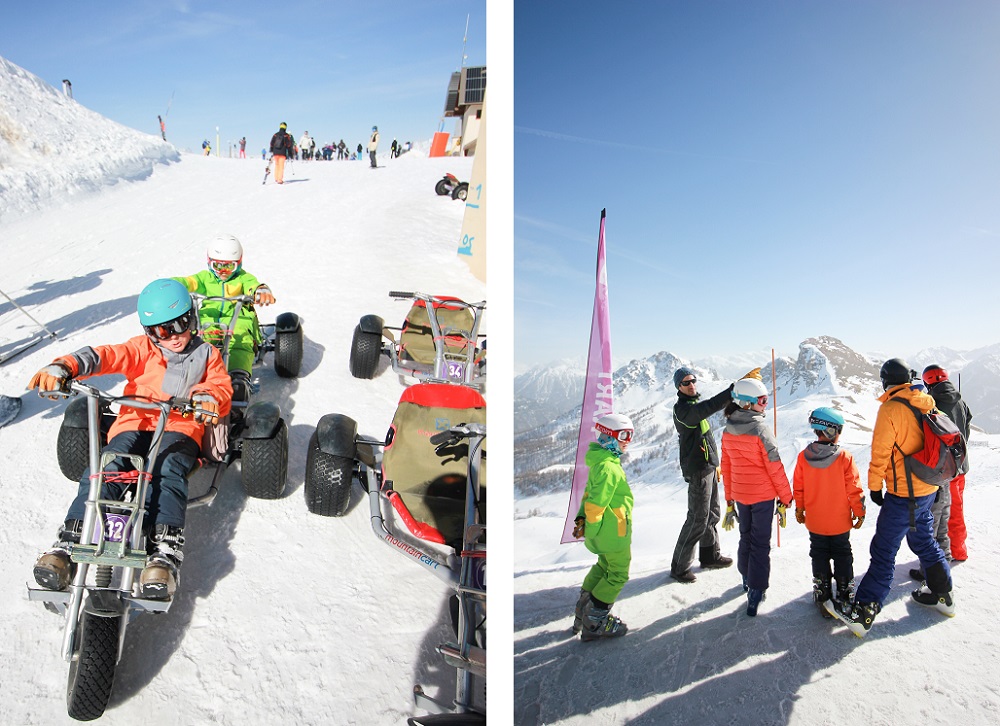 Au niveau du Téléphérique Serre Chevalier on enfourche un engins à roues (sorte de kart équipé pour la neige) pour glisser sur deux kilomètres de pentes. de descente sur des engins à roues. C’est très rigolo et très facilement en famille. Les enfants doivent par contre mesurer plus d’un mètre trente.