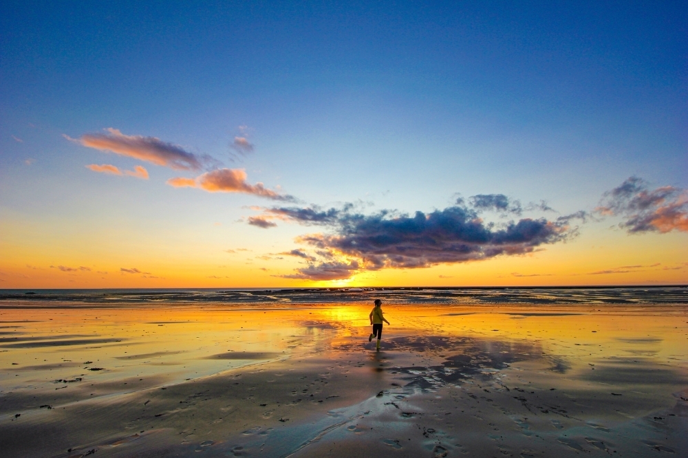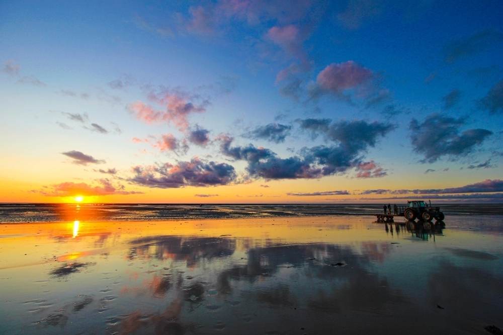 Par chance nous sommes arrivés au moment du coucher du soleil sur la plage de Bricqueville. Nous avons été accueillis par un ciel éclatant, fascinés par ses nuances de rouge et de jaune. Au loin les hommes de la mer rentrait de leur journée de travail pendant que les enfants jouaient entre les derniers rayons du soleil.