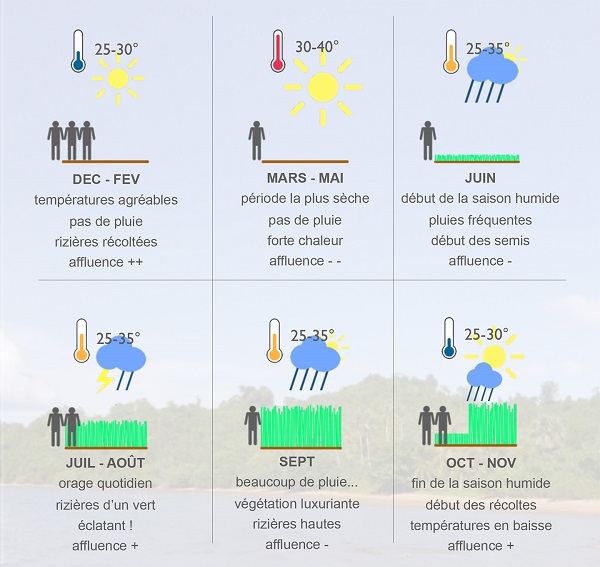Chaque saison a ses propres charmes au Cambodge et quelle que soit la période de l’année, votre famille y trouvera son compte. Bien sûr, vous privilégierez certainement les périodes de vacances scolaires (12 jours vous permettront tout à fait de découvrir une grande partie du pays. Bien sûr, un séjour plus long vous permettra d’en profiter d’autant plus) ; voici donc une infographie rapide qui vous permettra de choisir au mieux les dates de votre voyage :